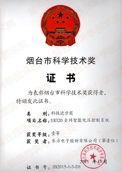 5月23日,烟台市2015年科学技术创新表彰大会在东山宾馆举行,股份有限公司E8320全网智能电压控制系统荣获“科学技术进步一等奖”。